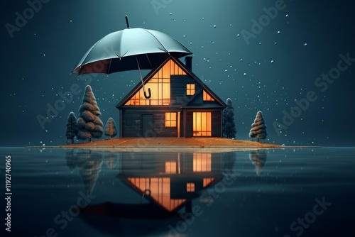 House insurance protecting family home on island during a flood at night