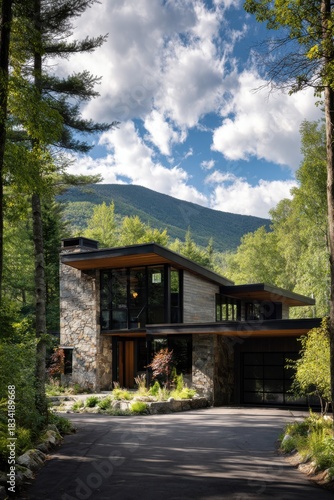 house, mountain, tree, nature, driveway, entrance, window, design, building, landscape, clear, sky, sun, architecture, residential, rural, property, stone, modern, greenery, home, front, yard, cloud, natural, light, scenic, fresh, air, harmony, environment, living, parking, peaceful, surrounding, sunlight, structure, calmness, day, functionality, roomy, open, space, entranceway, inviting, neighbourhood