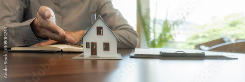 House model with agent asking costumer for contract to buy, get insurance or loan real estate or property.