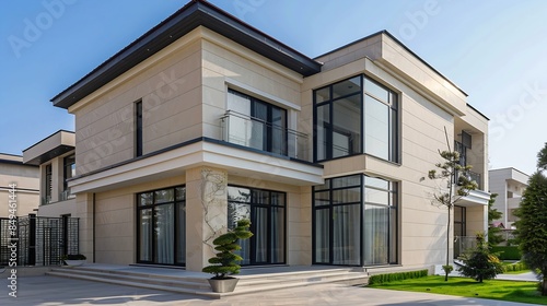 House or Villas Villas with Cream color Exterior view of 02 story house with modern design and having black glass windows : Generative AI