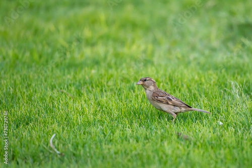 House Sparrow on grass at lodge in desert, Bitterwasser, Namibia