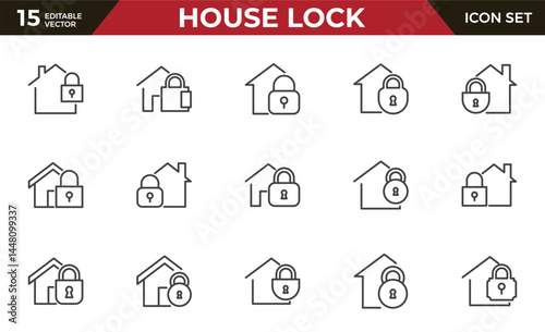 House with Lock Line Icon set. Minimalistic Linear Pictogram for Web and Graphic Design, Apps, Banners, Social Network and Cards