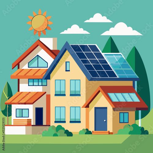 house, home, vector, building, illustration, estate, architecture, sky, roof, landscape, nature, cartoon, real, bungalow, grass, village, door, construction, property, window, tree, housing, residential, summer, solar