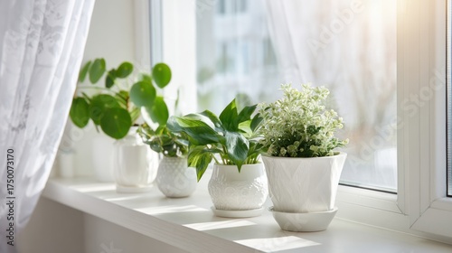 Houseplants on windowsill with soft morning sunlight, clean and minimal green interior scene