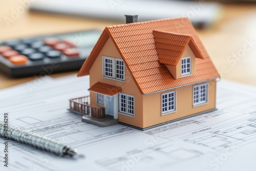 Housing loan concept, Model house on the table and people prepare the document and calculate lease finance as background, Generative AI