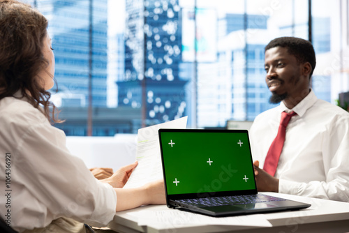 HR professional using mockup laptop during interview with joyful job candidate fitting company culture. Recruiter presenting salary package to smiling applicant on isolated screen notebook