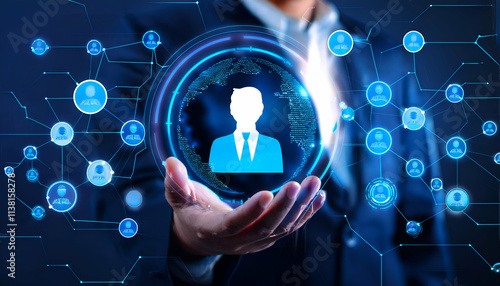 HRM or Human Resource Management, businessman show manager icon which is among staff icons for human development recruitment leadership and customer target group concept. Manager, research, target. ne