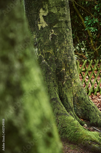 Huge green tree trunks covered with beautiful moss. Forest landscape.
