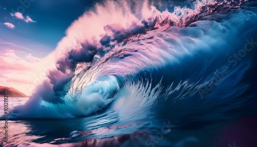 huge waves that destroy themselves in the shape of an arc in the dark blue ocean.generative ai