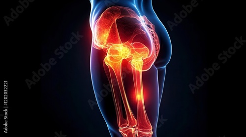 Human Anatomy Detailed 3D Rendering of Leg and Hip Joint with Pain Indication
