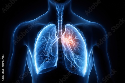 Human anatomy illustration showcasing detailed lungs with highlighted area indicating potential health issues, emphasizing respiratory system and its significance in overall well-being