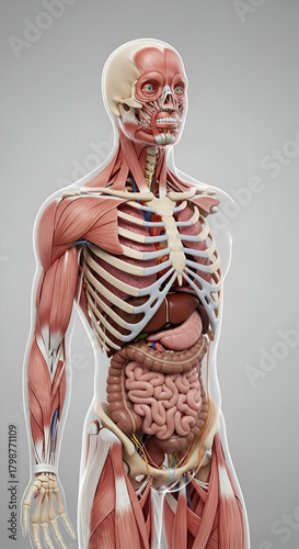 anatomy, human, skeleton, muscle, body, muscular, system, skeletal, illustration, medicals, internal, organ, structure, detailed, diagram, bone, rib, skull, torso, chest, arm, leg, tissue, facial, neck, abdomen, digestive, lung, liver, kidney, stomach, vein, artery, biological, health, science, education, study, learning, visual, render, realistic, perspective, cutaway, three-dimensional