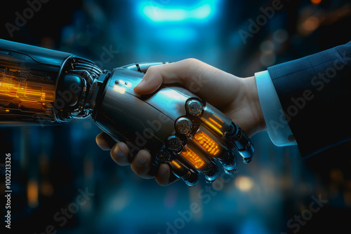 human, robotic, handshake, technology, collaboration, digital, background, futuristic, circuit, metallic, glowing, ai, partnership, business, innovation, formal, suit, light, pattern, advanced, sleek, harmony, machine, connection, man, mechanical, high technology, progress, integration, fusion, synergy, contrast, power, advancement, cooperation, cyber, future, glow, science, energy, art, blue, arm, brain, colours, connect, contact, creation, dream