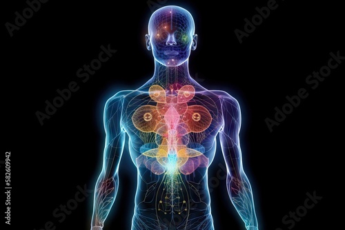 Human Body with Full Chakra Activation, Caused by Enlightment with Yoga Meditation, but also connected to AI in Astral Plane, generative ai