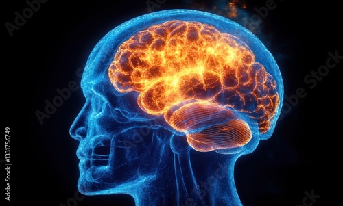 Human Brain with Neural Activity in Transparent Skull 3D Scientific Illustration