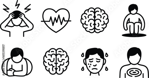 stress, cephalalgia, pain, heartbeat, pulse, cardiogram, brain, mind, thinking, depression, anxiety, sorrowful, crying, perspiring, distress, target, sharpened, mental health, emotion, feeling, psychology, health, wellness, human, person, body, therapy, medicals, illustration, icon, symbol, graphic, psychological
