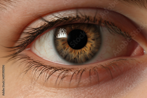 Human eye of a woman with colored iris of the eye with long eyelashes close up