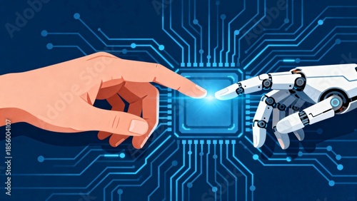 human hand, touching, finger, circuit board, blue background, technology, connection, innovation, cybernetic, electronic, interface, artificial intelligence, digital, future, interaction, mechanical, microchip, grid, line, dot, light, glow, design, illustration, graphic, symbol, concept, science