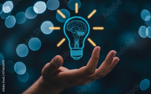 idea, innovation, creative, inspiration, brain, intelligence, ai, light bulb, glowing, technology, solution, concept, imagination, wisdom, cognition, mind, hand, holding, human, business, development, startup, strategy, digital, network, connection, future, abstract, dark, bokeh, thinking, power, science, visualisation