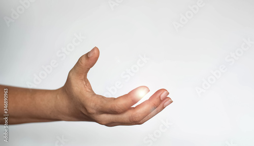 Human hand reach out and grab something,in front of background,sign and symbol of body language,,Lens flare effect