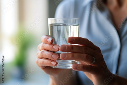 Human hands close up holding glass mineral water woman drinking fresh clear health pure refreshing beverage wellbeing thirsty detox aqua hydrate home natural liquid care transparent middle aged adult