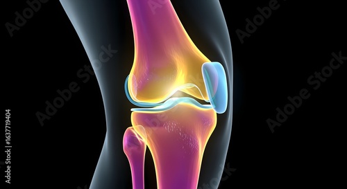 knee, joint, anatomy, illustration, pink, yellow, bone, cartilage, medicals, health, health care, science, education, scientific, structure, human, body, render, three-dimensional, digital, graphic, vibrant, artistic, colourful, x-ray, skeleton, orthopedics, femur, isolated, closeup, black background, pain, x-ray, medicine, leg, injury, spine, woman, blue, arthritis, muscle, back, bone, foot