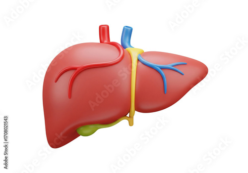 Human Liver Organ 3D Model with Gallbladder & Vessels. Medical Anatomy, Health, and Biology Education Concept. Isolated on White.