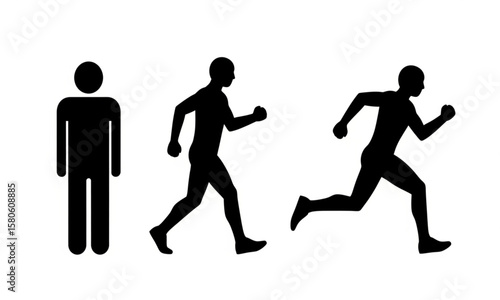 human, man, person, silhouette, icon, vector, run, running, walk, walking, racked, standing, jog, jogging, motion, movement, action, activity, exercise, sport, black, graphic, symbol, signs, pictogram, simple, minimal, isolated, design, clip art, figure, progress, speed, fitness, health, gym, track, race, direction, set, collection, website, app, interface