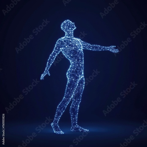 human, silhouette, glowing, line, dot, network, digital, technology, connection, light, art, abstract, pose, standing, wire, blue, background, figure, modern, futuristic, anatomy, virtual, illusion, design, shape, bright, creative, concept, networked, illuminated, representation, science, datum, structure, energy, movement, innovation, dimension, visual, signal, communication, realism, cybernetic, aesthetic, form, character, dynamic