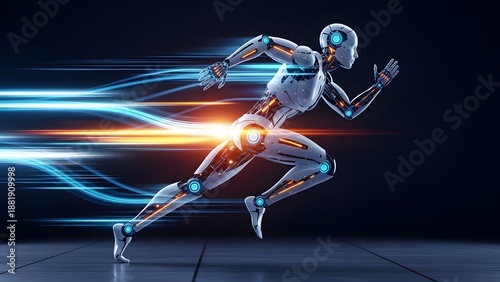 Humanoid robot running at high speed with light trails. Artificial intelligence performance and agility. Cyborg sprinter racing through a digital environment with motion blur