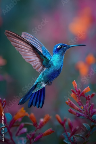 hummingbird, bird, nature, flower, nectar, beauty, wildlife, animal, tropical, flying, flora, fauna, environment, colours, vibrant, wing, beak, feather, garden, spring, summer, botanical, floral, outdoors, closeup, detailed, colourful, natural, small, avian, pollination, pollinator, ecological, ecosystem, wild, orange, pink, green, blue, light, shadow, background, foreground, portrait