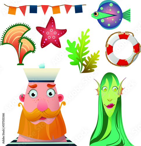 humorous set of cartoon characters of a sailor and a mermaid with items - algae, flags and fish. Flat design for decoration, needlework, creativity, etc.