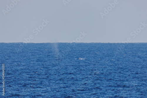 陸から見えたザトウクジラ(ナガスクジラ科)の群れが泳ぐ様子。 英名学名:Humpback Whale, Megaptera novaeangliae 観光協会主催の、バスで島を巡り、ザトウクジラを捜すホエールウォッチングバスツアー。 東京都伊豆諸島八丈島-2025年