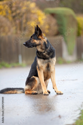 dog, dog, sheepdog, german shepherd dog, village, fence, garden, sit, sitting, beautiful, breed, breeding, accessory, necklace, leash, training, training, guard dog, guarded, watchful, street, weather, rain, wet, walk