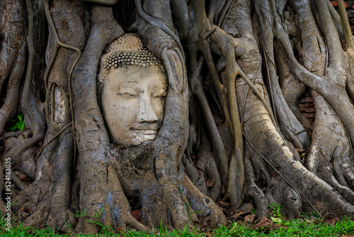 Hundred-year-old Buddha head in tree roots, Wat Mahathat, Ayutthaya, Thailand