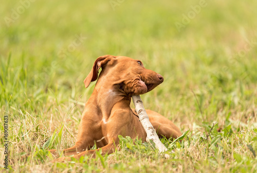 Hungarian vizsla dog play with a stick