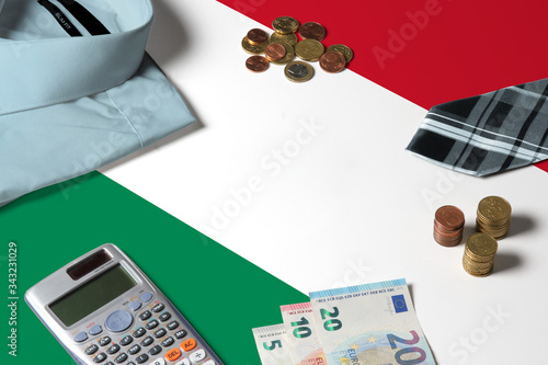 Hungary flag on minimal money concept table. Coins and financial objects on flag surface. National economy theme.
