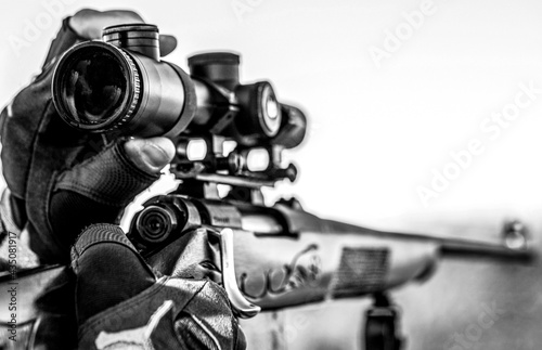 aiming, army, bullet, cartridge, closeup, concept, equipment, firearm, gun, human, hunt, hunter, hunting, male, man, military, nature, people, period, person, predator, professional, rifle, season, shooter, shot, shotgun, sighting, sharpshooter, soldier, sport, target, technology, war, weapon, black, white, wild