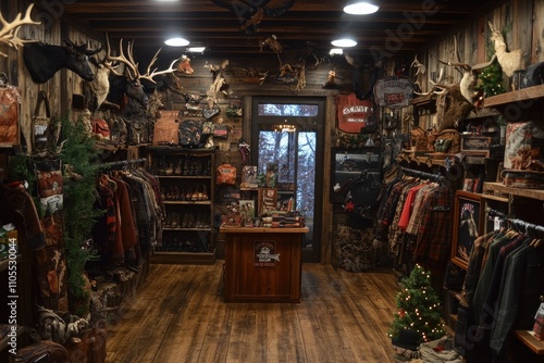 clothing store, interior, rustic, antler, taxidermy, boot, accessory, retail, display, merchandise, shopping, fashion, style, outdoors, wilderness, cabin, filed, wood, wooden, decor, decoration, christmas tree, light, counter, shelf, rack, traditional, vintage, lifestyle, consumerism, commerce, small business, winter, cold weather, nature, wildlife, animal, country style
