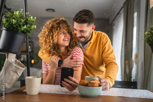 man, woman, people, family, love, bonding, hug, breakfast, food, hot drink, home, couple, morning, mug, human relationships, meal, routine, corn bread, eat, browse, use, mobile phone, type, text, living room, happy, smile, boyfriend, girlfriend, enjoyment, happiness, togetherness, romantic, 2, casual attire, avocation, hobby, caucasian, copy space, male, female, cheerful, domestic, indoor, together, young, adult