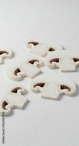 Hyper-Realistic 3D Render of Neatly Arranged Mushroom Slices on White Background