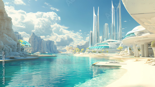 digital, beach, crystal, clear, water, futuristic, architecture, three-dimensional, illustration