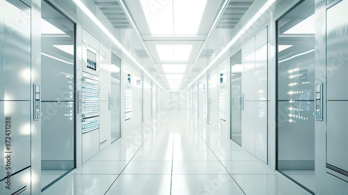 Hyper-realistic image of a futuristic healthcare data center advanced computational systems bright white lighting