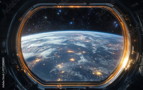 Hyper-realistic view of Earth from spacecraft window in 5K digital art astronomy exploration space travel