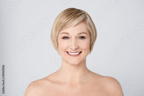 smiling, skincare, bare shoulder, attractive, bare, beautiful, casual attire, caucasian, cheerful, clean, elegant, female, fresh, glowing, happy, isolated, lovely, middle-aged, modern, neck, honed, posing, pretty, purity, sensual, shoulder, skin, topless, white, woman