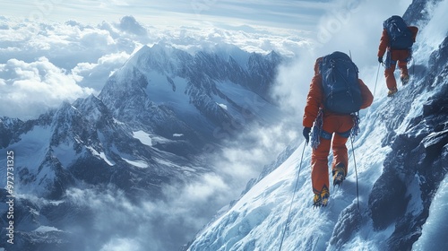 Ice climbing team ascending a frozen glacier, with ropes, ice tools, and a vast icy landscape below. 4K hyperrealistic photo.