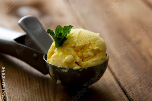 Ice cream closeup scoop, round icecream ball in scoop spoon on rustic wooden background