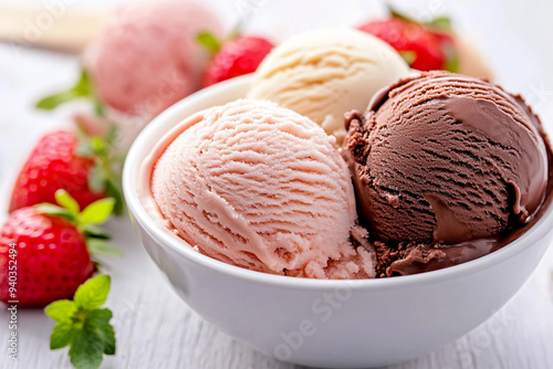 ice creams scoops that various flavor in white bowl