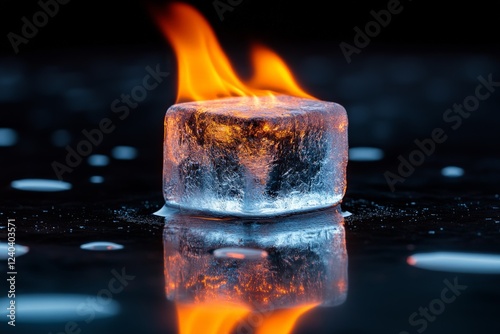Ice cube burns with bright flames against a dark background creating a striking visual contrast