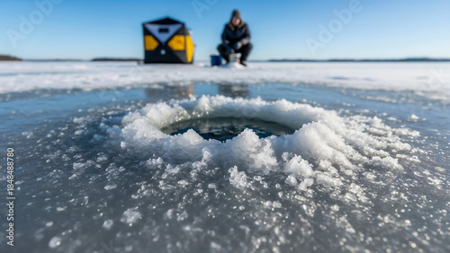 Ice Fishing Hole with Man and Tent in Background – Symbol of Patience and Winter Solitude